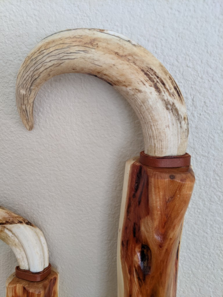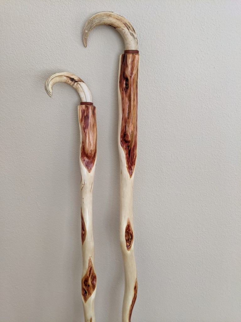 Below you’ll see a project that was a custom order. I would have never thought to make diamond willow hiking sticks with warthog tusks as toppers! But that’s what someone wanted – one for him and his wife.